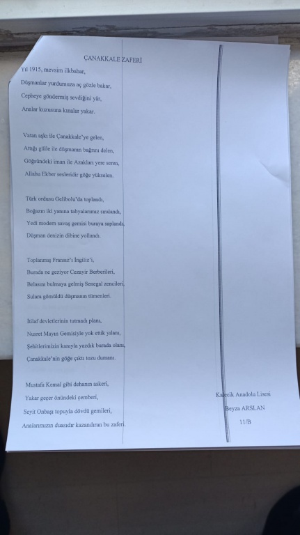 Okumuz 11/B sınıfı öğrencilerinden Beyza Arslan 18 Mart Şehitleri Anma Günü ve Çanakkale Deniz Zaferi yıl dönümü anısına yapılan şiir yarışmasında 3. olmuştur. Öğrencimizi tebrik ederiz.